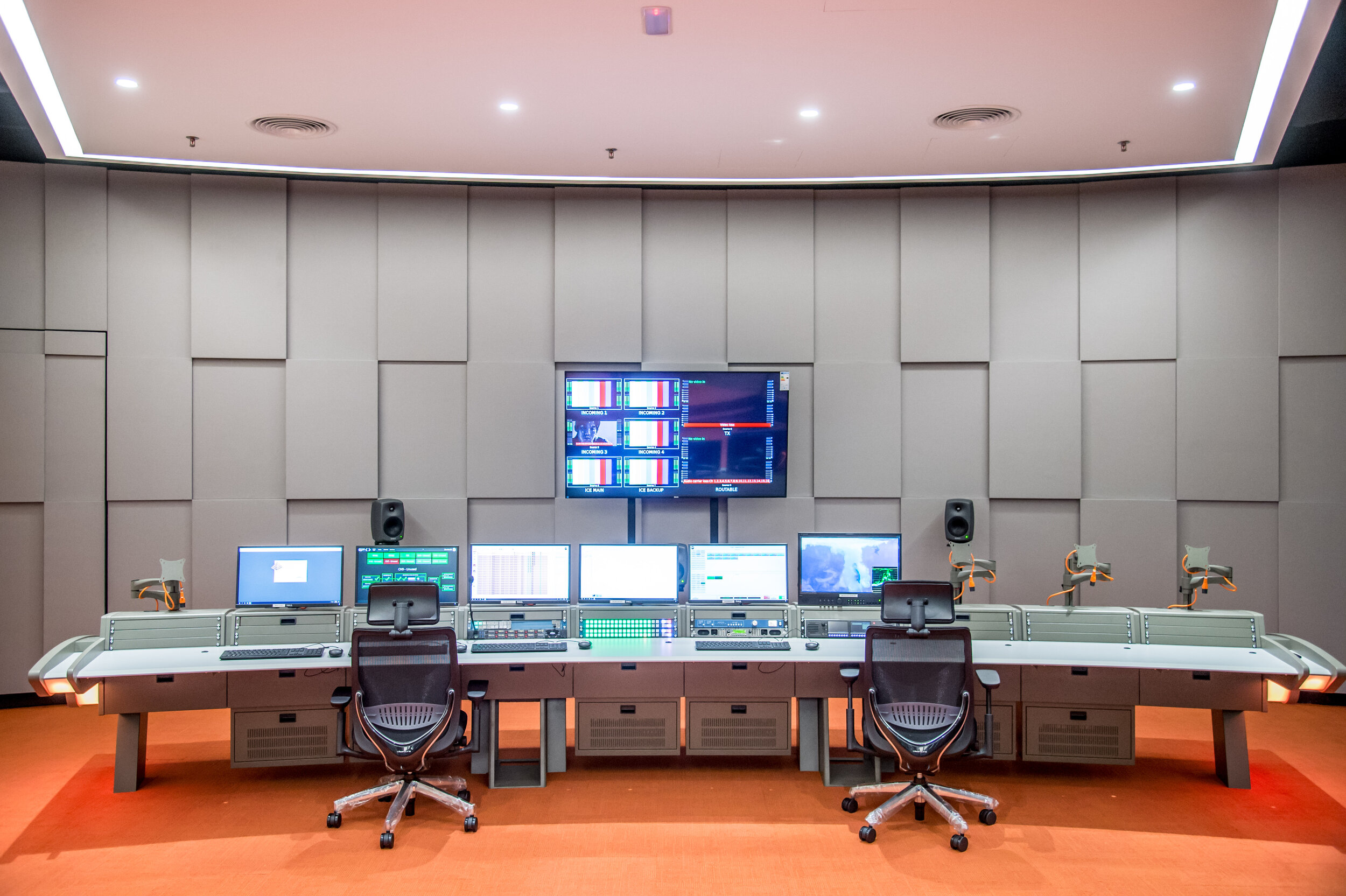 An entire functional and operations area was designed by Ideal Systems to offer a coherent communication hub as well as a highly functional design. For example, every operator in every area, be it in lines, MCR, ingest, or presentation suite, just needs to turn around & they would be able to look directly into the monitor wall of the other area. This enhances communication and provides a level of confidence to the various operators. Another aspect is maintenance, where engineers from MCR are not more than 20 steps/10 seconds away from the datacentre entrance. This enables quick root cause analysis of faults when the need arises to access the datacentre physically.